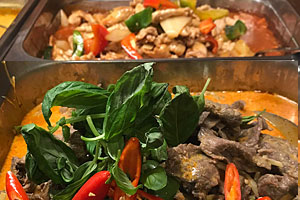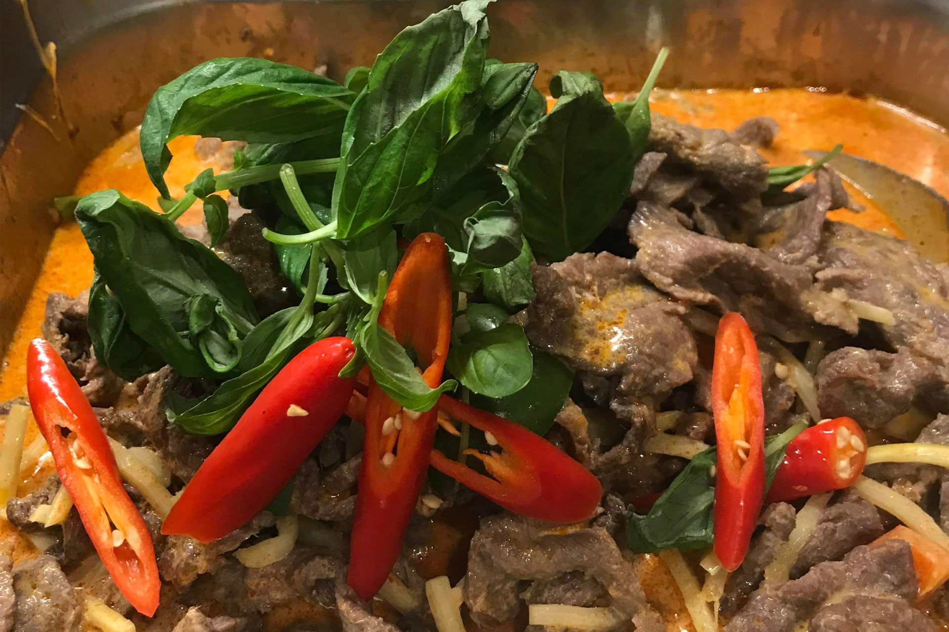 - Paistettua kanaa, punaista currya, kookosmaitoa, paprikaa, bambua ja basilikaa